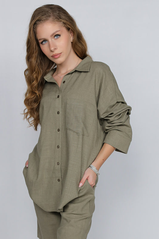 Cămașă Ilinkas damă din in kaki – croială lejeră, buzunar frontal, nasturi decorativi