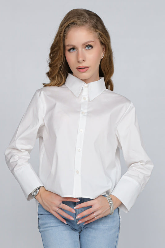 Cămașă Ilinkas din poplin alb din bumbac – croială lejeră, guler clasic, spate mai lung
