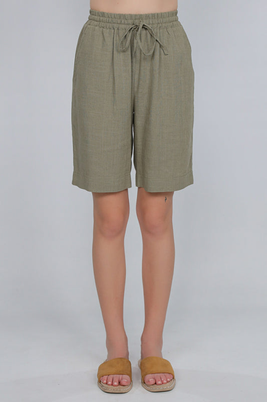 Pantaloni Ilinkas de damă scurti din in kaki – talie elastică cu șnur, croială lejeră