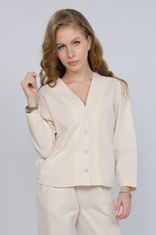 Cămașă Ilinkas damă din in crem – croială lejeră, detalii cu dantelă fină, nasturi perlați