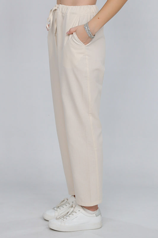 Pantaloni Ilinkas de damă din in crem – talie elastică cu șnur, croială lejeră