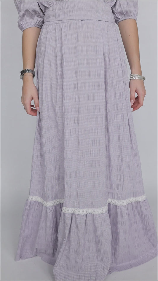 Rochie Ilinkas lungă din bumbac creponat lila – decolteu suprapus, mâneci bufante, talie marcată