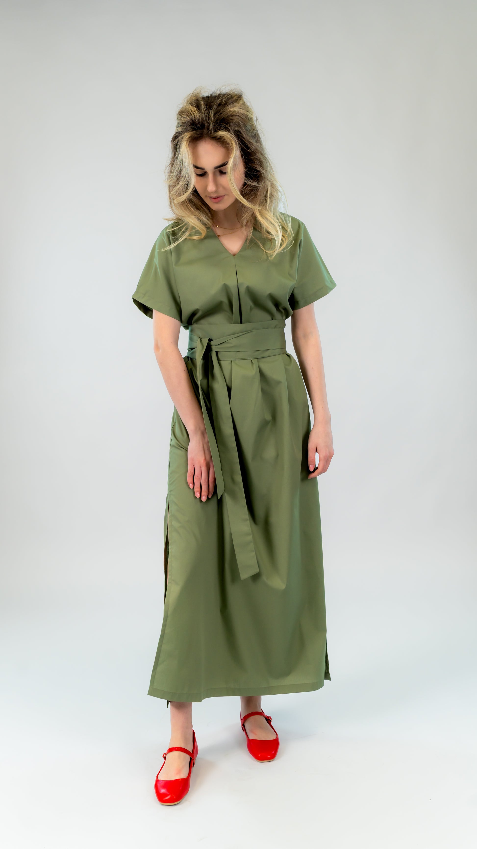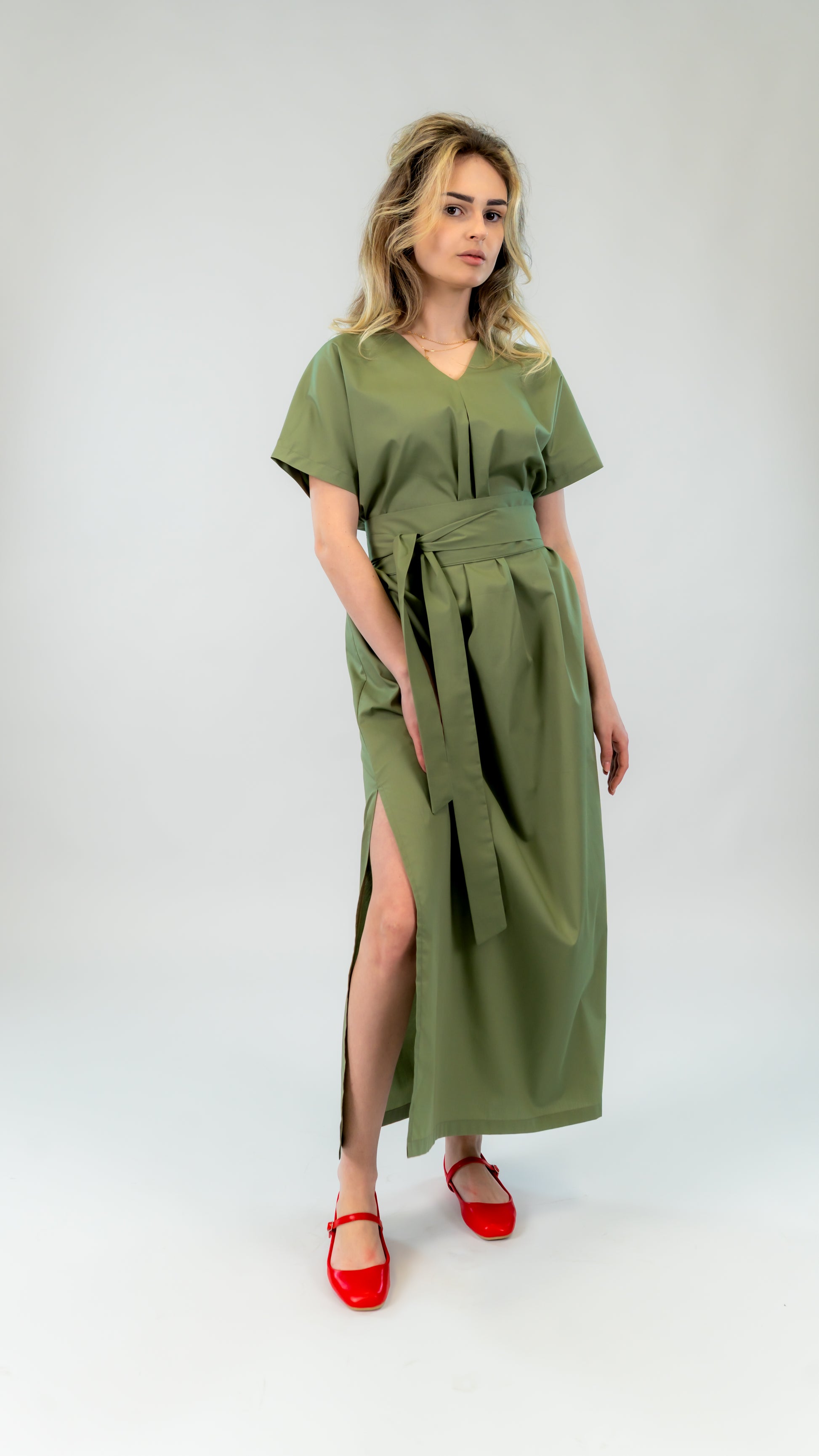 Rochie din bumbac kaki cu slit lateral – croi lejer și cordon în talie | Ilinkas