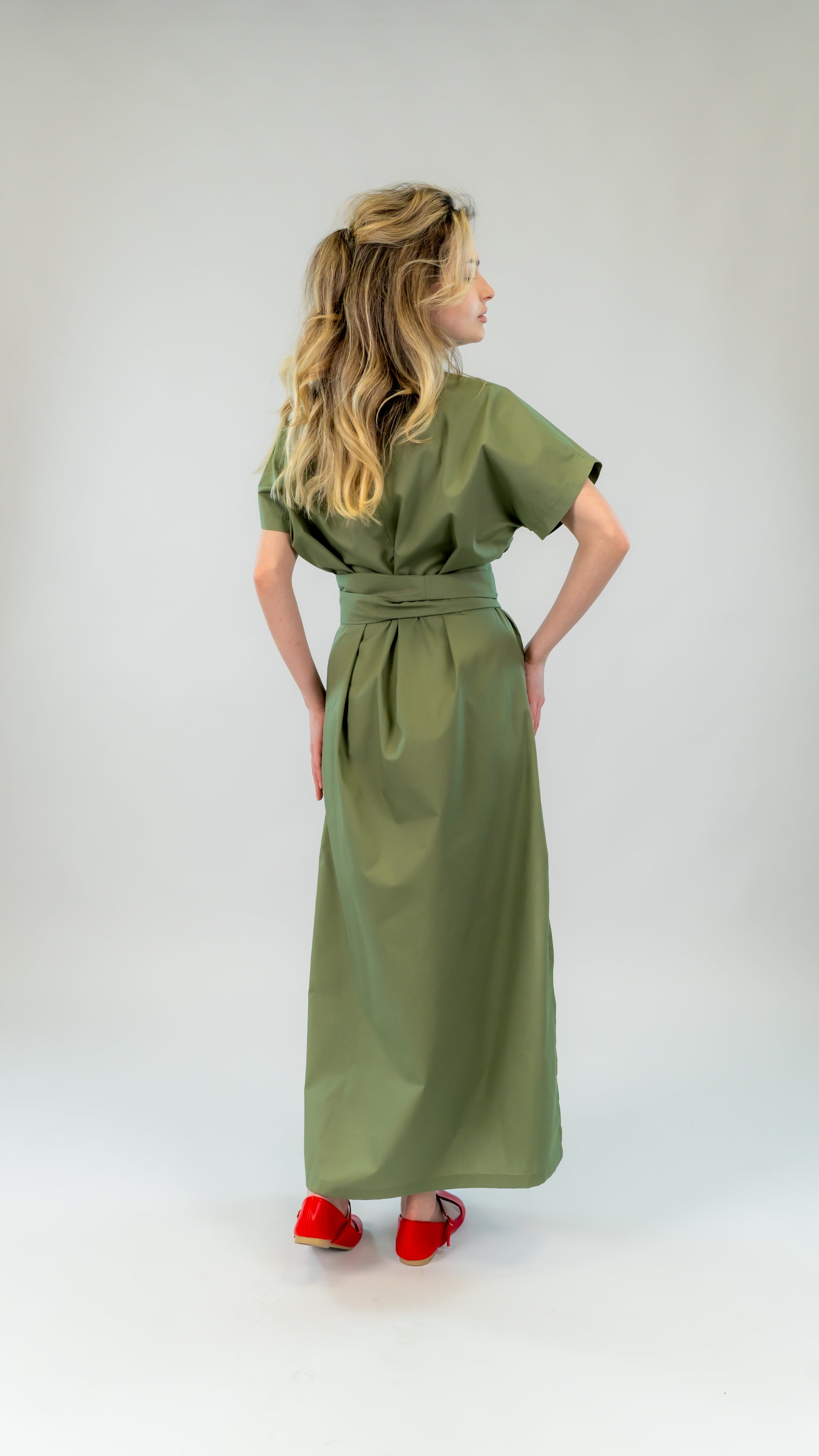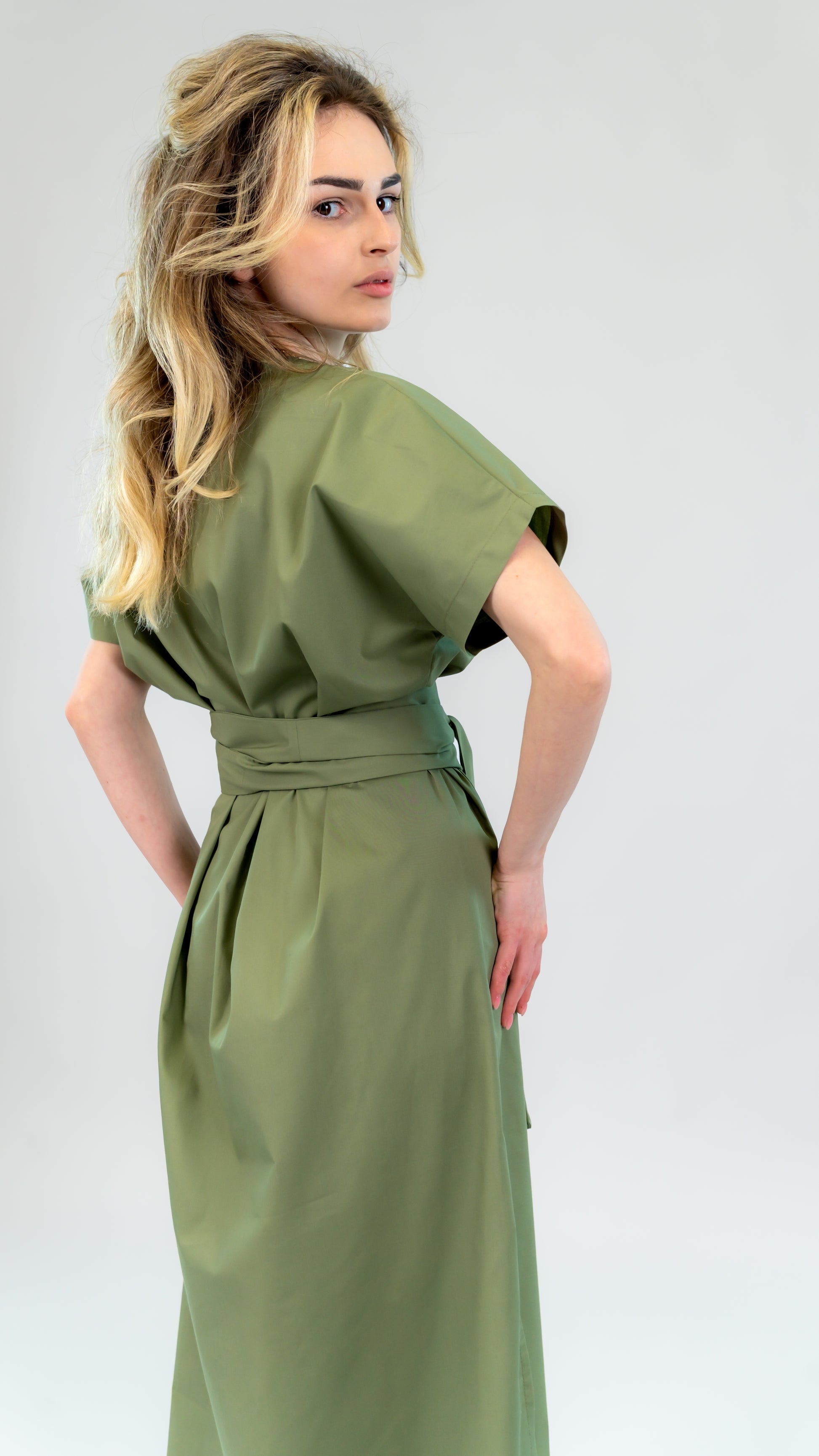 Rochia kaki din bumbac de la Ilinkas îmbină lejeritatea cu eleganța casual. Are croi relaxat, slit lateral pentru libertate de mișcare și cordon lung care îți subliniază talia.
